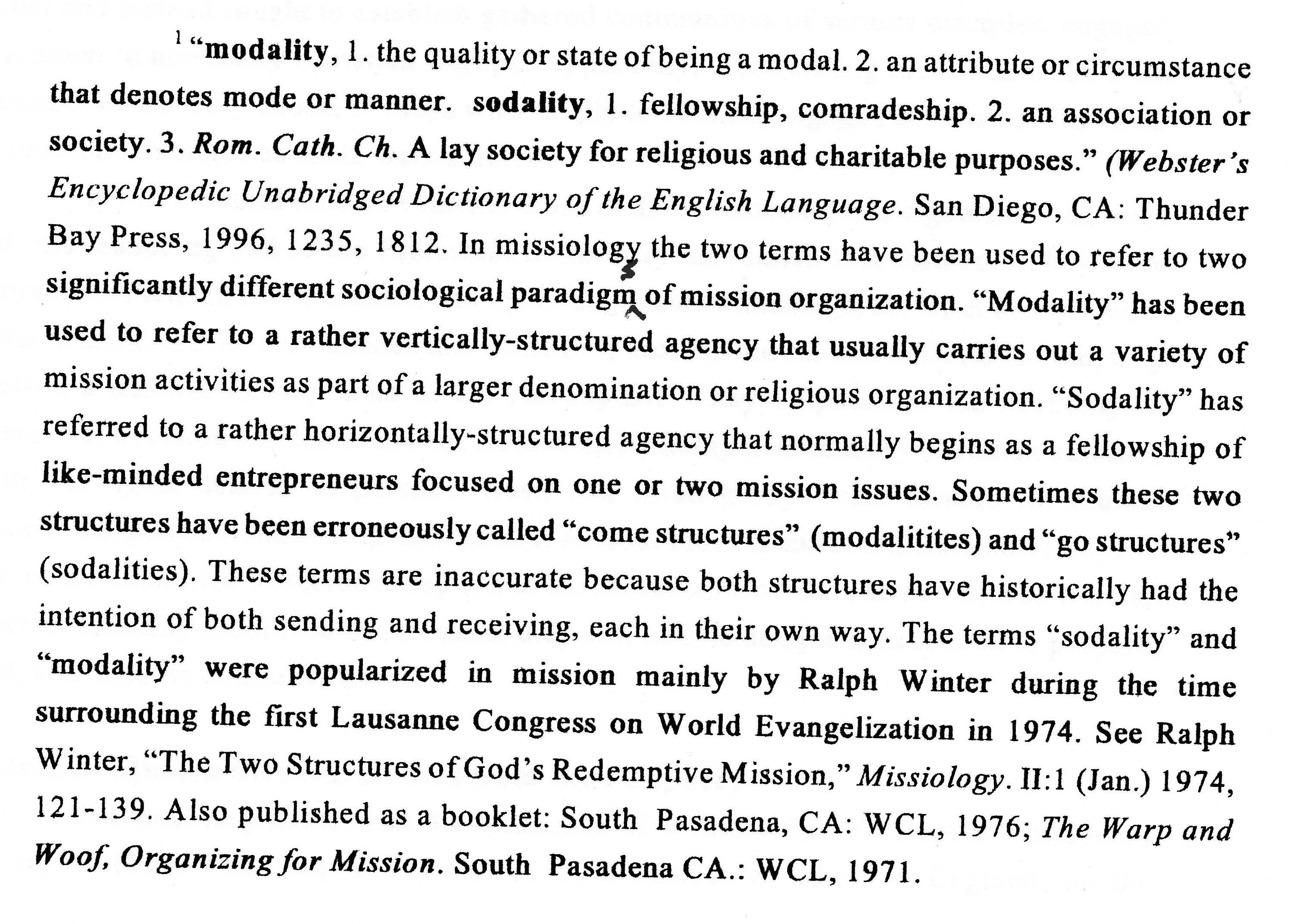 Modality and Sodality Explained *These are excerpts from a paper written in 2006 by Paul E. Pierson entitled “Beyond Sodalities and Modalities: Organizing for Mission in the Twenty-First Century” Share this: Click to share on X (Opens in new window) X Click to share on Facebook (Opens in new window) Facebook Like Loading...