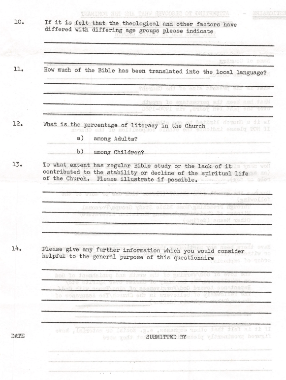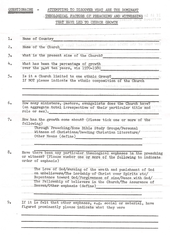 Church Growth Questionnaire *The introductory paragraph is an excerpt from a letter written by Ernest Oliver, Secretary of the Evangelical Missionary Alliance in London to Donald McGavran on May 21, 1980* Share this: Click to share on X (Opens in new window) X Click to share on Facebook (Opens in new window) Facebook Like Loading...