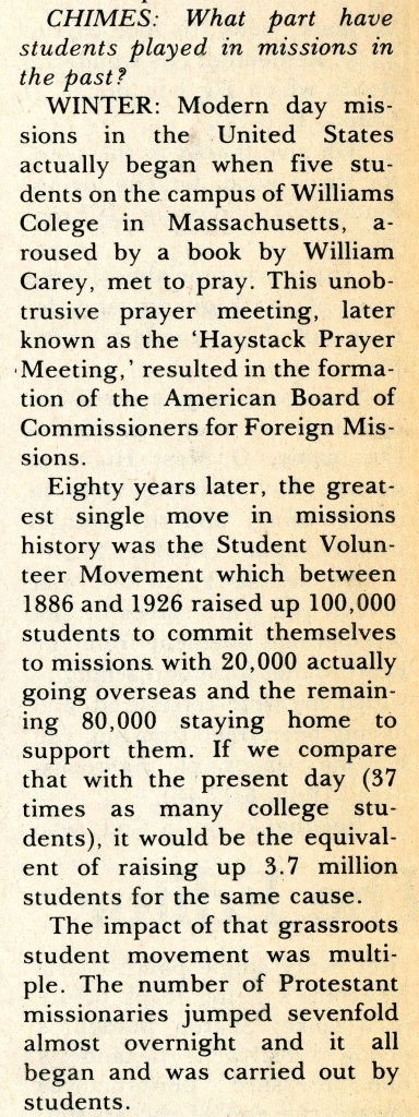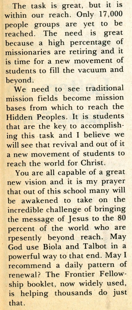 The Rise of Missions Involvement *Excerpts are from an article in Biola University’s newspaper “The Chimes” Volume 47 Number 12 with the date of November 19, 1982. The article is entitled “Noted Missiologist Speaks At Talbot”* Share this: Click to share on X (Opens in new window) X Click to share on Facebook (Opens in new window) Facebook Like Loading...